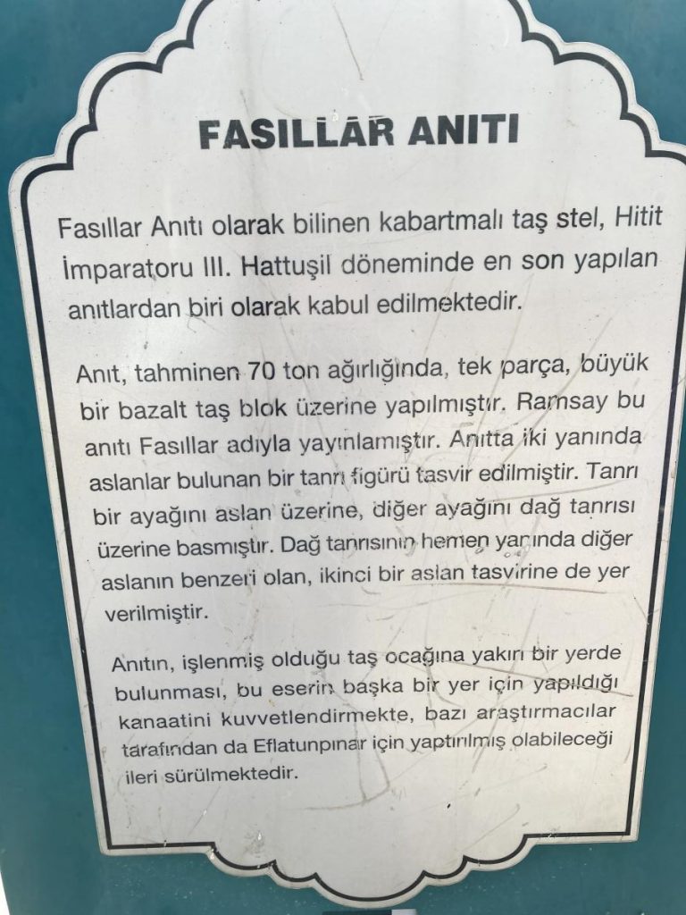 Konya-Seydişehir istikametinde giderken Fasıllar köyü tabelasından sağa doğru toprak yola sapıyoruz. Beş kilometre bozuk olmayan bu toprak yoldan Fasıllar Köyü’ne ulaşıyoruz. Beyşehir-Seydişehir bisiklet turumuz esnasında burayı görmek istemiştik ama şimdiye nasipmiş. Köyün içinden dar bir yokuş ile ulaşılan bölge adeta tarih kokuyor. Sağda tarihi kabartma ve süslemelerin olduğu kayalar, solda o meşhur(!) Hitit Kaya Anıtı.