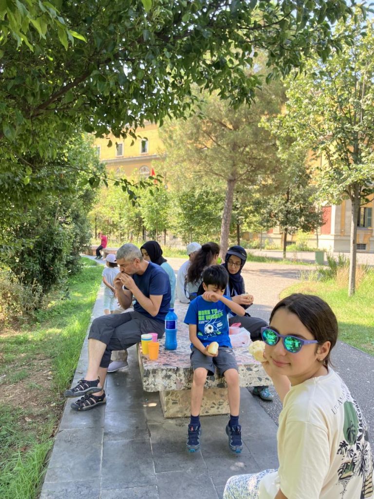 Saat 10.00 gibi Skanderbeg meydanına yakın, ağaçların gölgesindeki banklarda sandviçlerimizi yedik. Uykumuzu arabada tamamlamıştık, karnımızı da burada doyurduktan sonra vilayeti adımlamaya hazırdık.