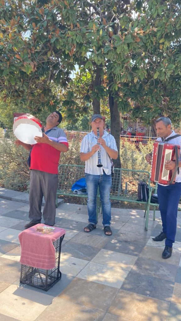 Bir yandan sokak çalgıcılarının sesi duyuluyor. Bizi görünce (Türk olduğumuz paçalarımızdan akıyordu ki) , İzmir’in dağlarında çiçekler açar marşını çaldılar. Dinledik, al bayrağımızı çıkarıp salındık, bağışımızı yaptık. Saati böylece 12.00 ettik.